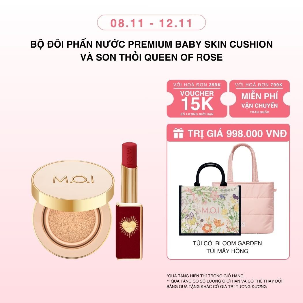 Tên sản phẩm:Bộ Đôi Phấn Nước M.O.I Premium Baby Skin Và Son Thỏi Cao Cấp Queen Of Rose